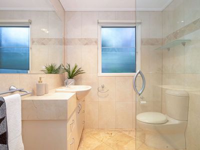 Morning walks through Sweetwater Creek to the Granites, Norman Ave cafes and Olivers Hill Beach, and afternoons spent in the pool and spa under the shade of beautiful palm trees. Relaxed peace in the sunken fireside lounge is complemented by family togetherness in the open family room, and unbridled leisure in the lower floor's rumpus area, complete with its own bathroom facilities and storage room.