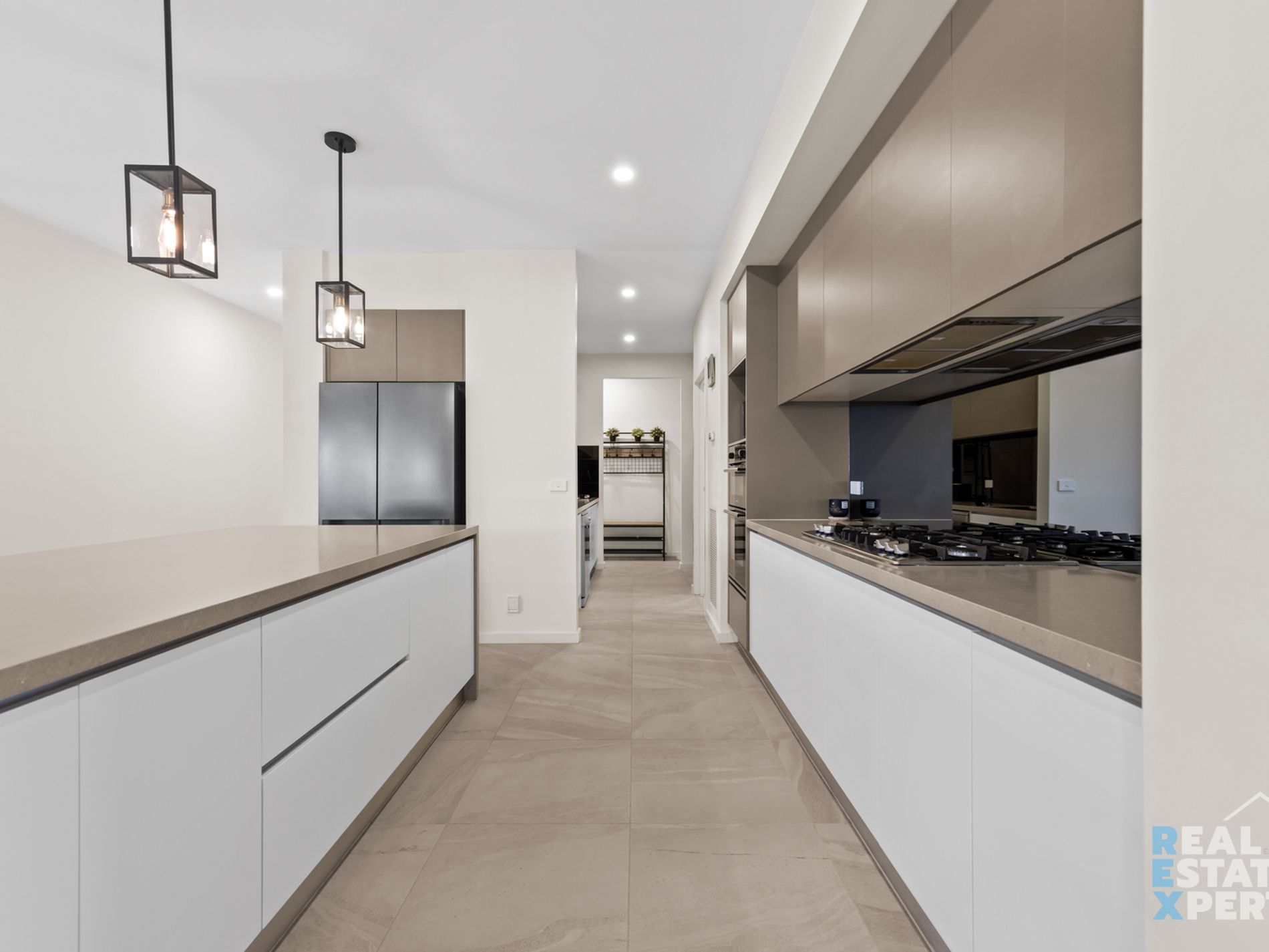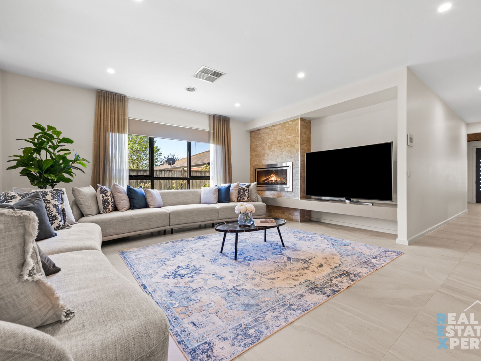 The heart of the home is the designer kitchens, the home offers 2 kitchens featuring stone benchtops, a large island bench with stone waterfall, quality stainless steel appliances including a dishwasher, glass splashback, and striking pendant lights. The second kitchen provides added flexibility for extended families or entertaining on a grand scale. The main lounge offers a cosy built-in fireplace, perfect for those cooler months, while custom curtains throughout the living areas add a touch of elegance.