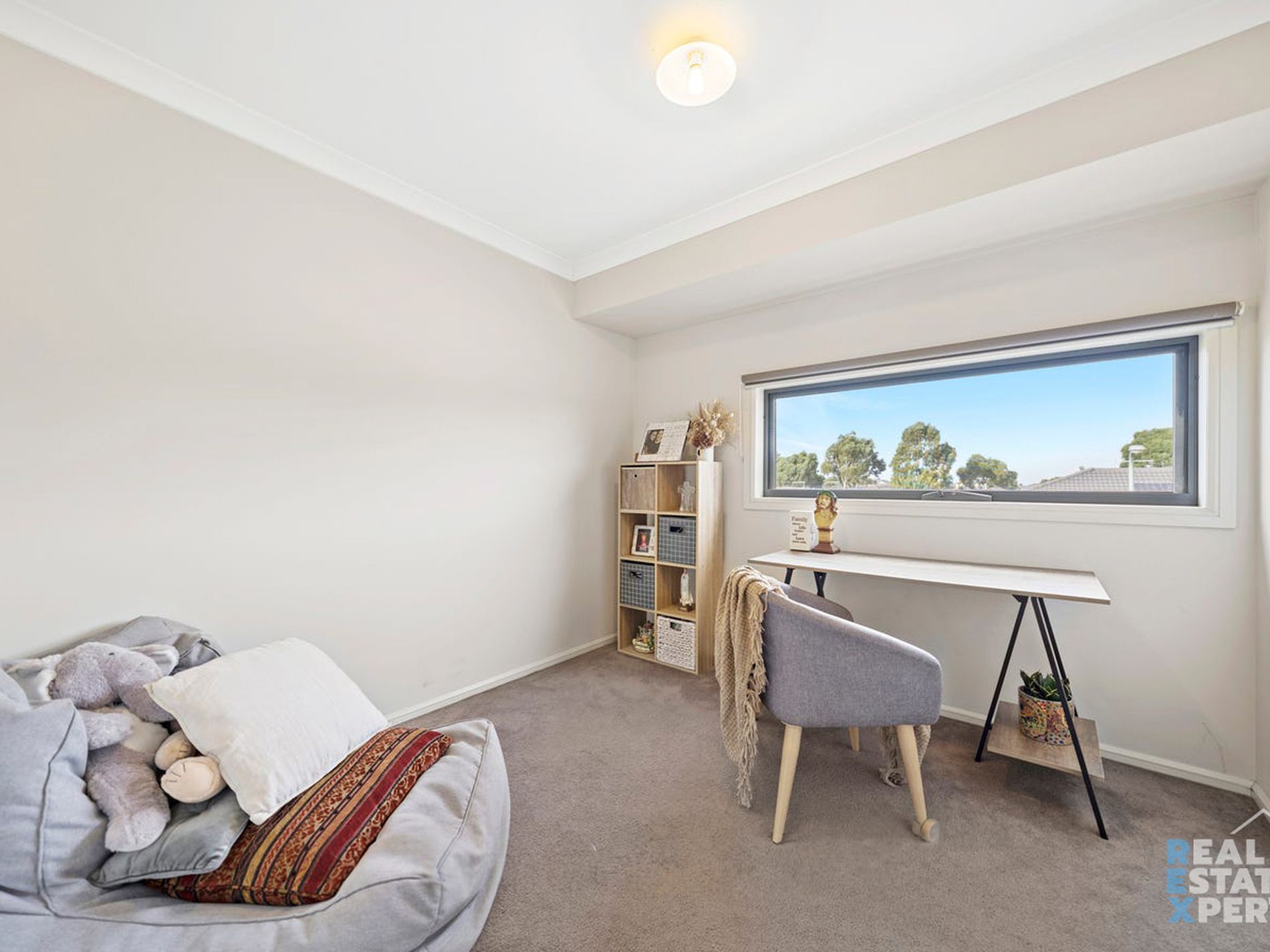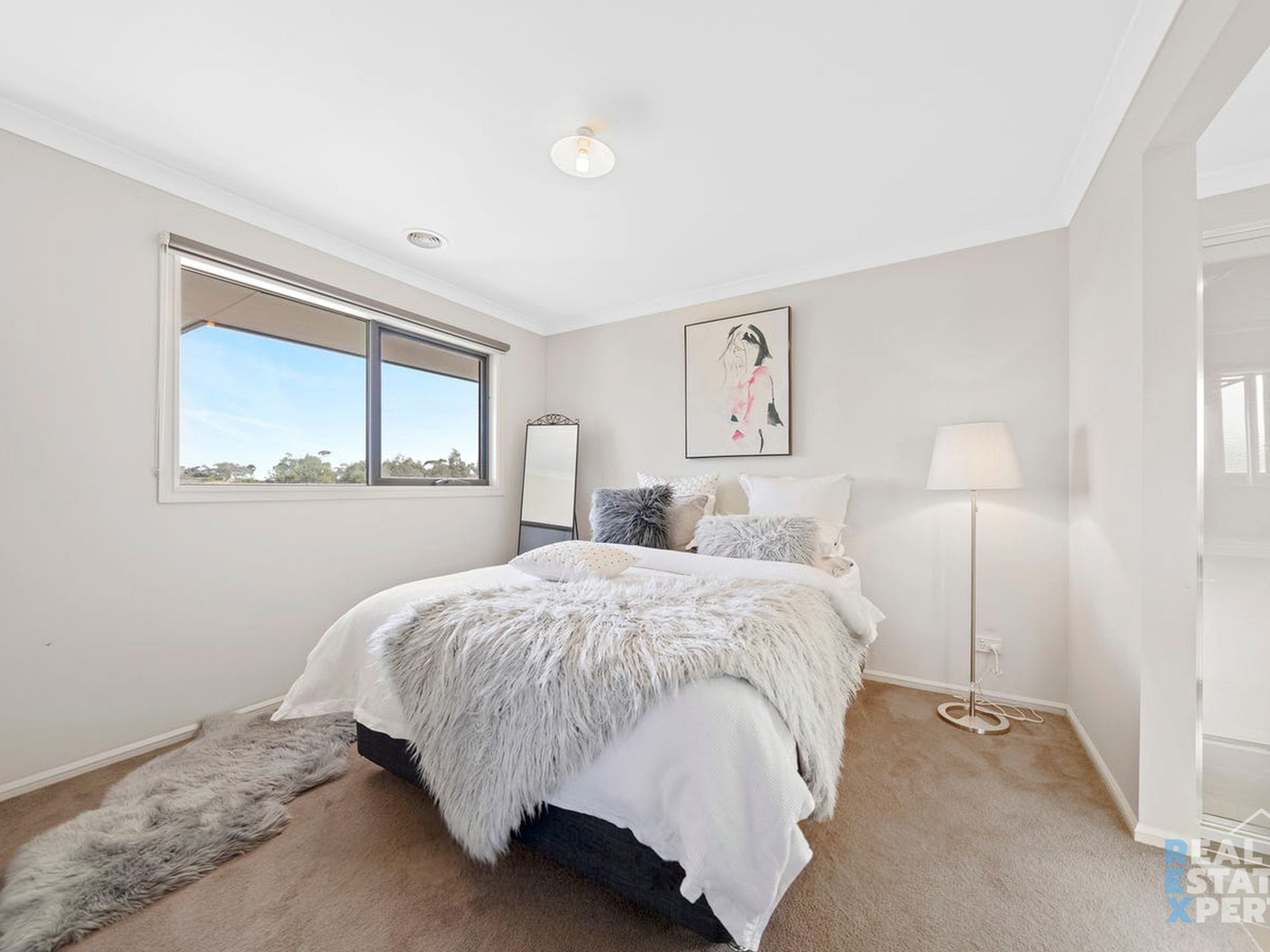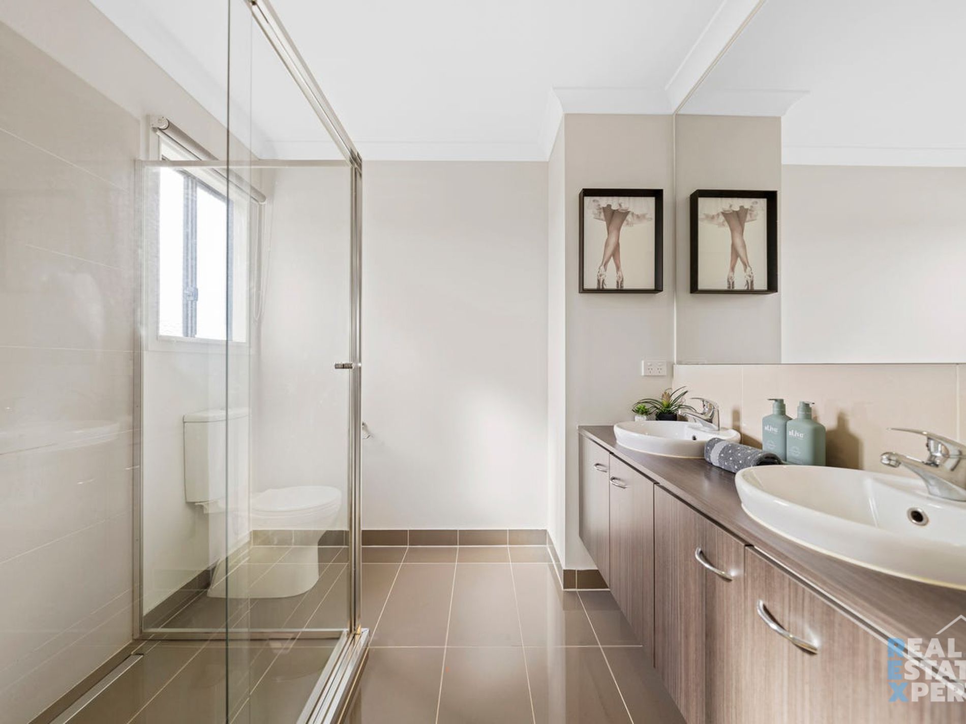 Upstairs, a well-positioned study nook introduces the accommodation wing. The master bedroom is a standout feature, complete with a walk-in robe and a beautifully appointed ensuite featuring a double shower and his-and-hers vanity. Three further bedrooms, all with built-in robes, ensure plenty of space for the growing family.
