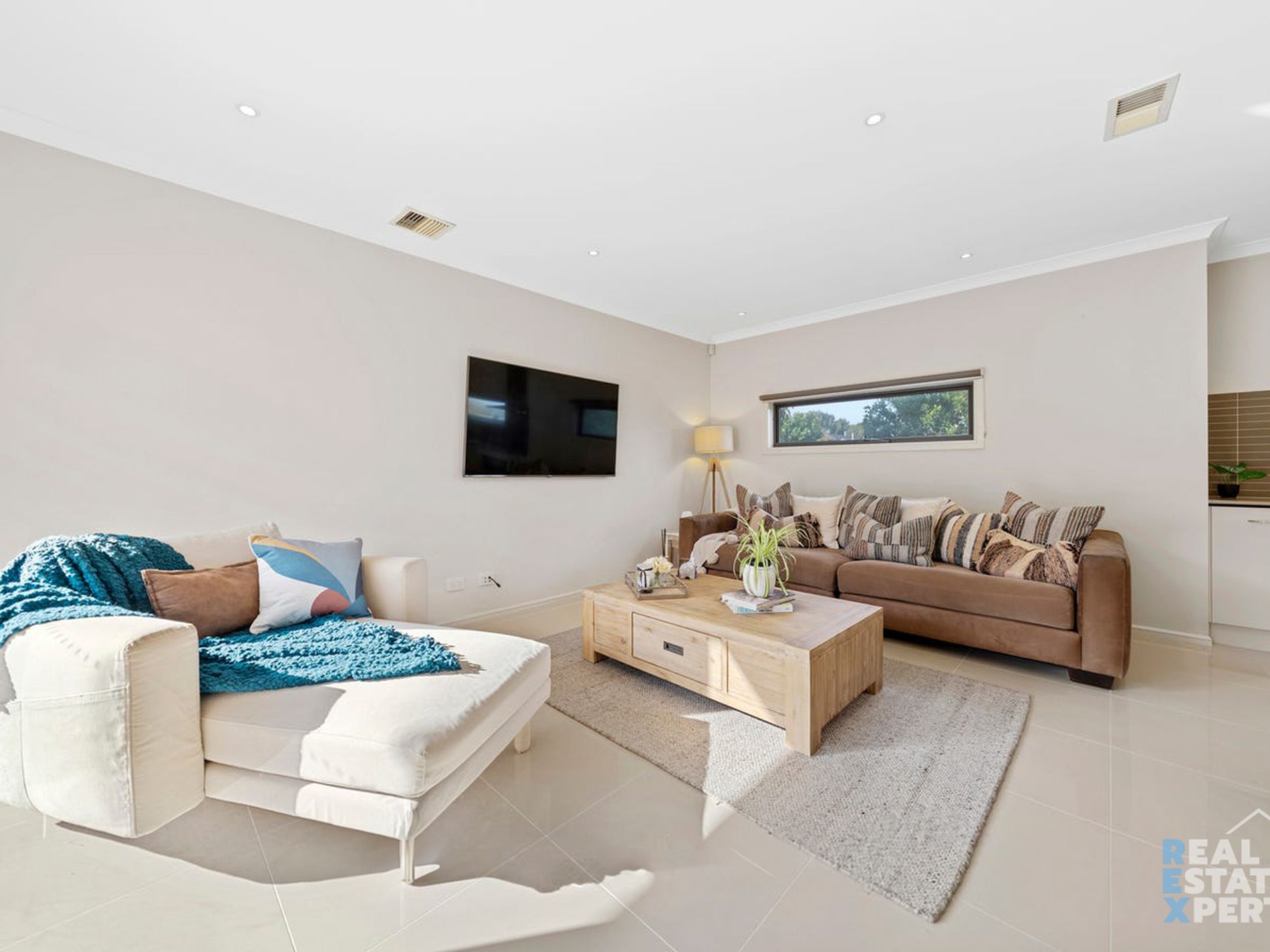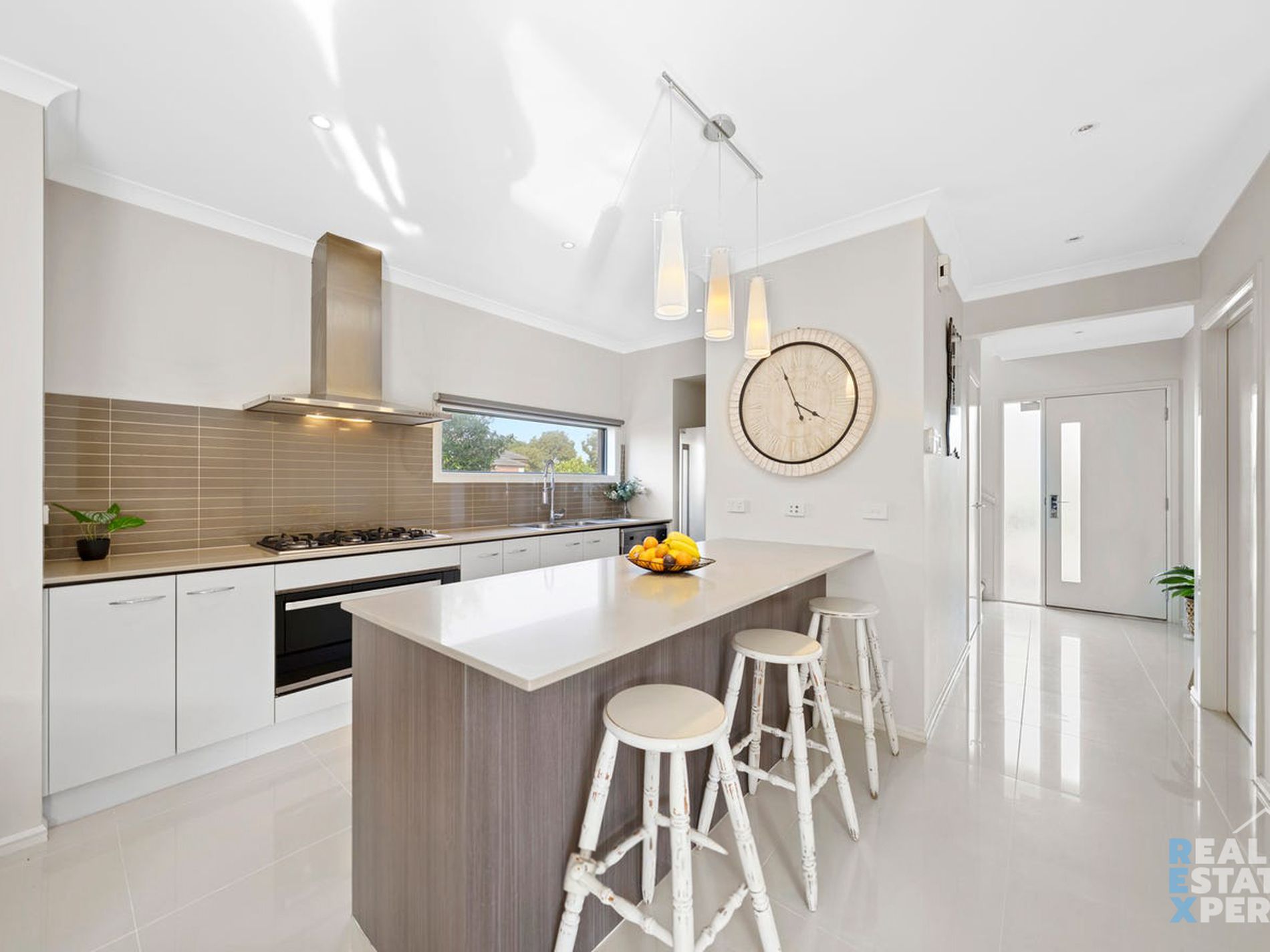 The open-plan kitchen, meals, and lounge area sets the tone for relaxed family living and effortless entertaining. A stylish kitchen showcases a generous island bench, five-burner cooktop, stainless-steel appliances, dishwasher, and ample cabinetry — all overlooking the light-filled living zone that seamlessly connects to the outdoor alfresco and low-maintenance backyard. It’s the perfect setting to host family and friends all year round.